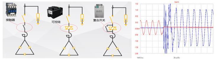 เนื่องจากความจริงที่ว่าการสลับตัวเก็บประจุแบบขนานในช่วงก่อนหน้านี้ประสบความสําเร็จผ่านคอนแทคเตอร์ซึ่งมีเวลาตอบสนองในระดับที่สองข้อเสียเปรียบร้ายแรงของมันคือกระแสไฟฟ้าขนาดใหญ่ในระหว่างการสลับในกรณีที่รุนแรงอาจถึง 50-100 เท่าของกระแสไฟฟ้าที่ได้รับการจัดอันดับของตัวเก็บประจุชดเชยส่งผลให้เกิดแสงโค้งอย่างมีนัยสําคัญและก่อให้เกิดความเสียหายต่อตัวเก็บประจุและคอนแทคเตอร์จากการดําเนินงานที่เกิดขึ้นจริงของโหลดในสถานที่ทางเลือกสําหรับคอนแทคเตอร์เช่นสวิตช์ซิงโครนัสสวิตช์ไฮบริดและสวิตช์ไทริสเตอร์ได้ค่อยๆเกิดขึ้นในตลาดทางเลือกเหล่านี้ได้ปรับปรุงอย่างมากในการสลับที่ศูนย์แรงดันไฟฟ้าและการขัดจังหวะที่ศูนย์กระแสอย่างมีนัยสําคัญลดความเสียหายของอุปกรณ์ที่เกิดจากการสลับกระแสไฟฟ้า